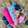 - Trzy pieluszki – dwie tetrowe jedna muślinowa. Pieluszki wykonane z naturalnego materiału, jakim jest bawełna, przydają się do wielu rzeczy związanych z pielęgnacją dziecka. Atutem jest to że można prać je w wysokich temperaturach i bardzo szybko schną więc można ich używać praktycznie cały czas. Przydadzą się między innymi w trakcie przewijania maluszka, podczas kąpieli, jako otulacz do snu, w czasie karmienia oraz w wielu innych sytuacjach. Pieluszki nie uczulają i są miękkie i delikatne dla skóry maluszka.